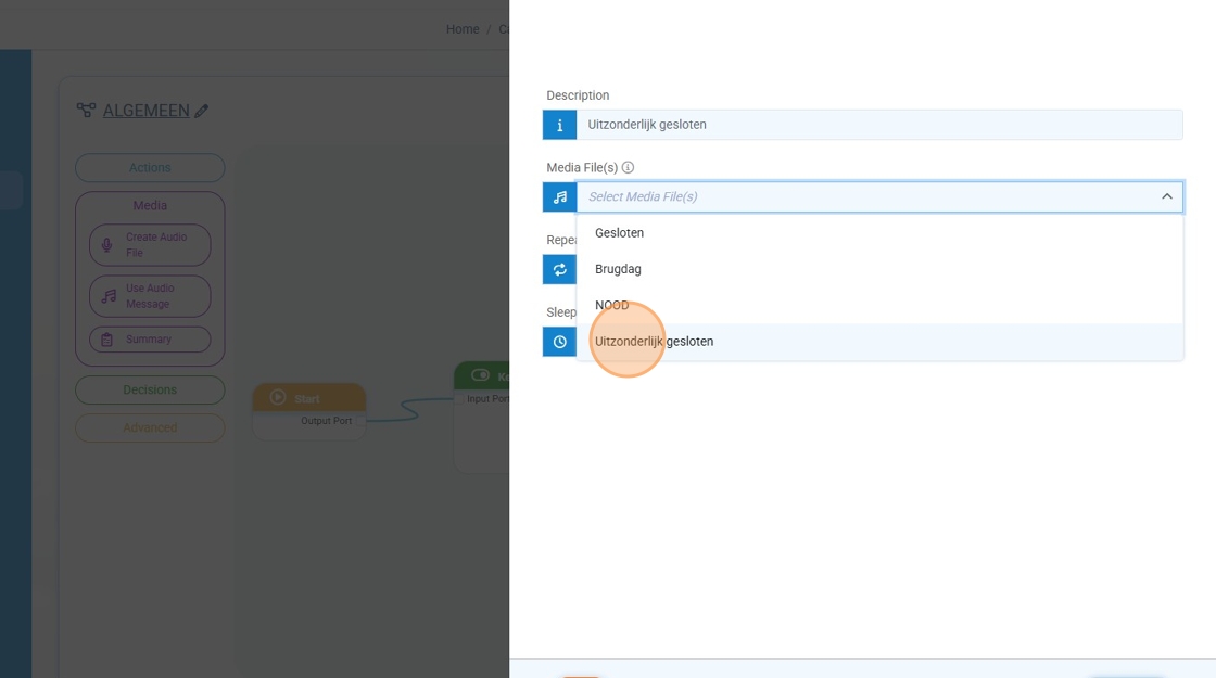 Step 6: In the left-side menu we click "Media" and then we drag the "Use Audio Message" to the callflow