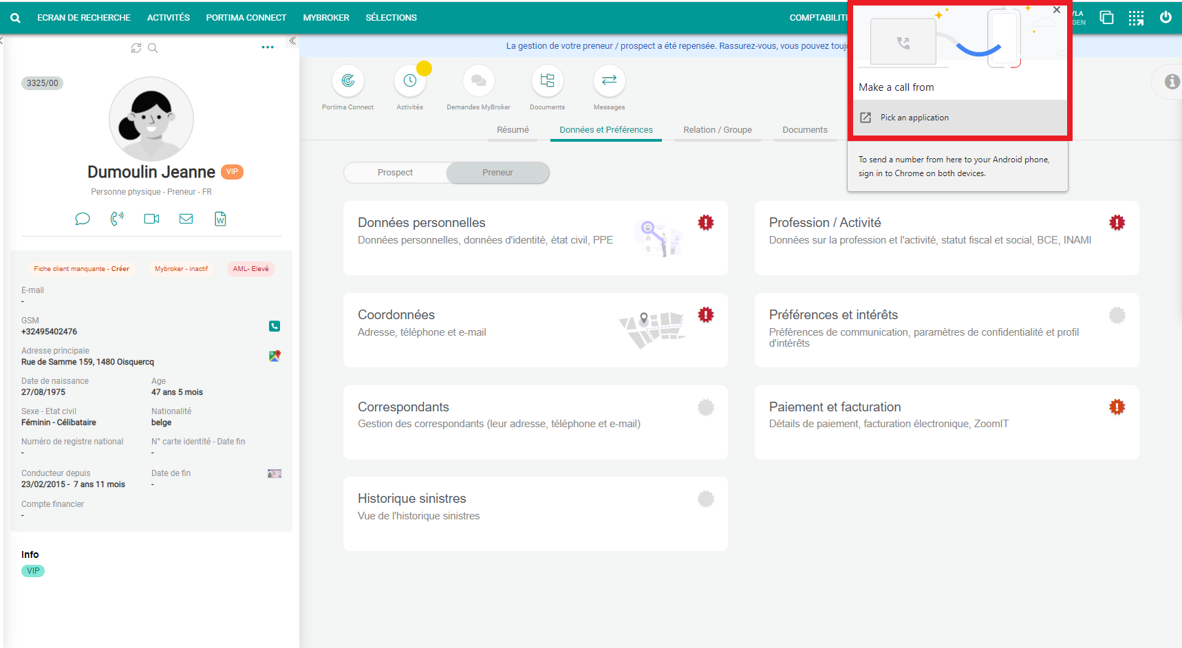 Étape 1 : Ouvrez la fiche client d'un client et cliquez sur le combiné téléphonique à côté de son numéro de téléphone.