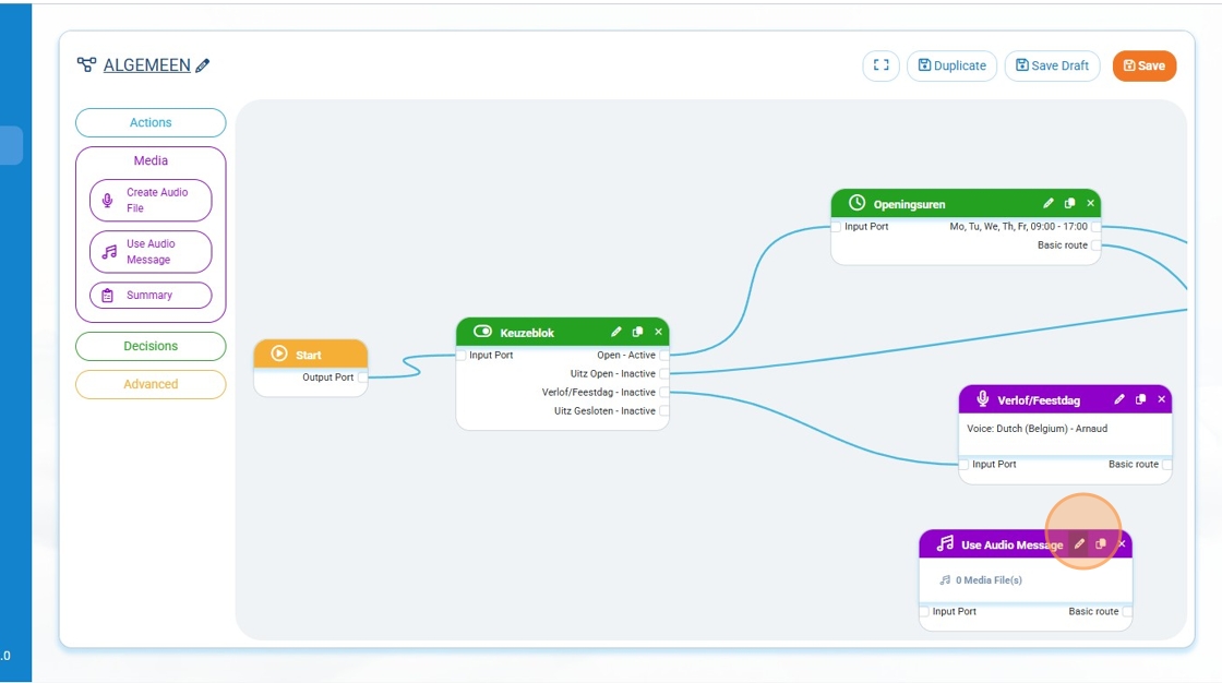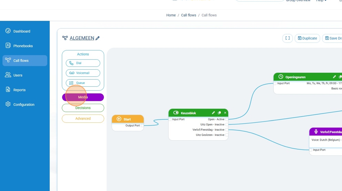 Étape 6 : Dans le menu de gauche, cliquez sur Médias, puis faites glisser Utiliser un message audio dans le flux d’appels.