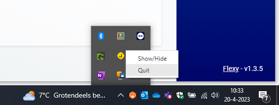 Étape 1 : Fermez l'application Flexy Desktop. Cliquez sur la flèche pour afficher les icônes masquées, puis cliquez avec le bouton droit sur l'icône de l'application Flexy, puis sélectionnez Quitter. Cela fermera l'application Flexy.