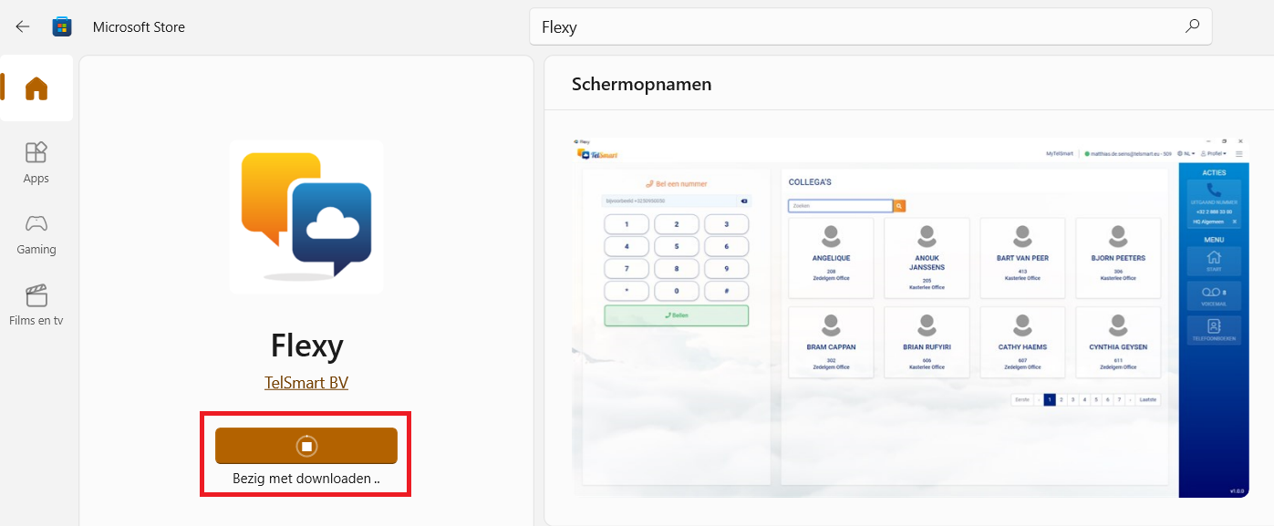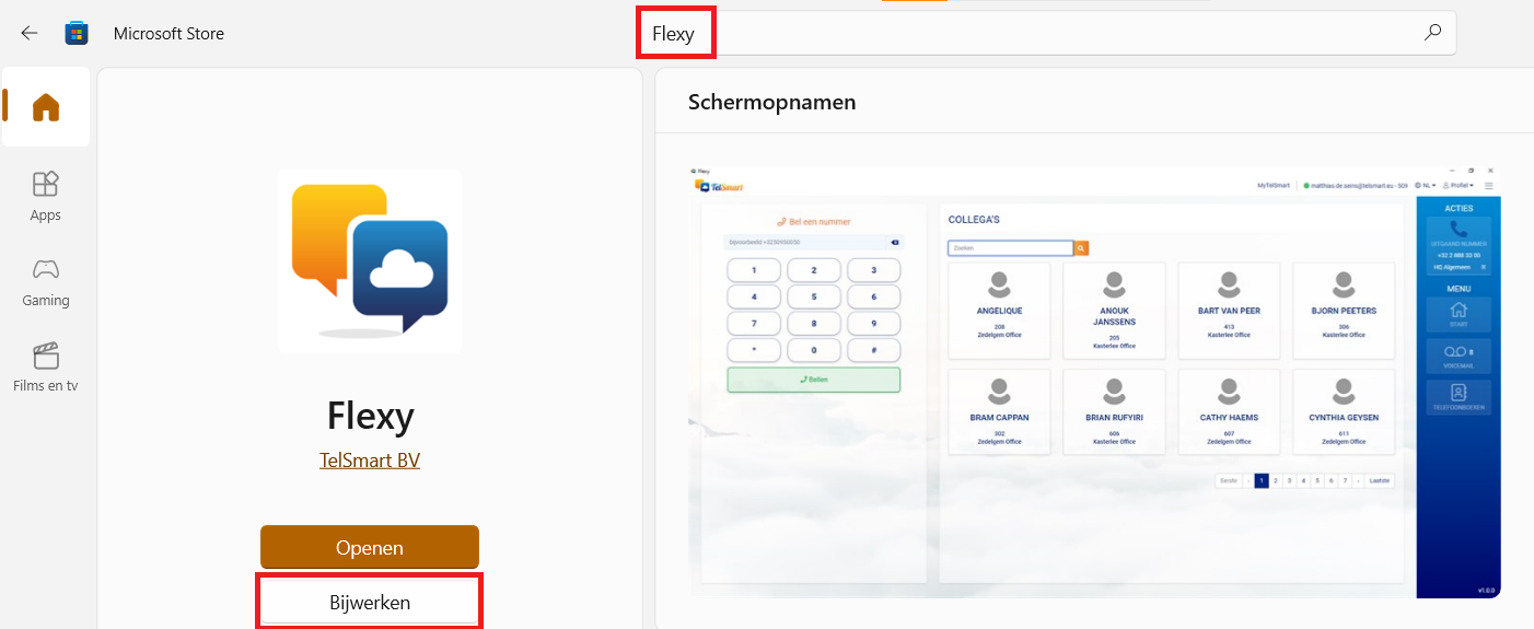 Étape 2 : Une fois dans la boutique Microsoft, vous devez entrer le mot Flexy dans le champ de recherche. Cela vous permet de rechercher le magasin Microsoft derrière notre application de bureau pour passer des appels. Vous cliquez sur Flexy puis choisissez mettre à jour pour appliquer les dernières mises à jour de notre application Flexy Desktop.