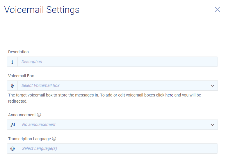 Stap 7: Vul onderstaande velden in. Geef het blokje een omschrijving. Klik in het veld Select Voicemail Box, om een beschikbare voicemail te kiezen. Bij Announcement kan je nog kiezen dat de mensen eerst een specifieke boodschap uit de mediabibliotheek te horen krijgen vooraleer ze de bieptoon horen om in te spreken.