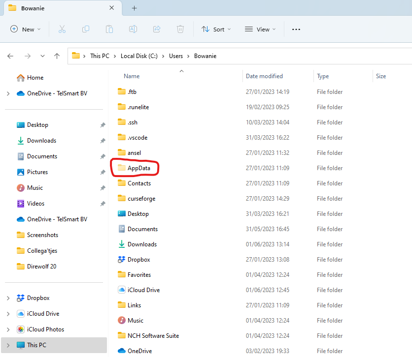 Stap 4: Bij de volgende stap zie je nu dat de map AppData van kleur verschilt in vergelijking met de andere mappen. Dit is omdat AppData een verborgen map is, deze hebben we nu zichtbaar gemaakt door de voorbije stap Computer instellingen. We openen de map AppData.