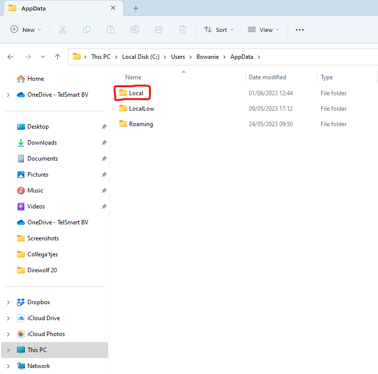 Stap 6: Scrol naar beneden in de map Local tot je de map Temp terug vind.