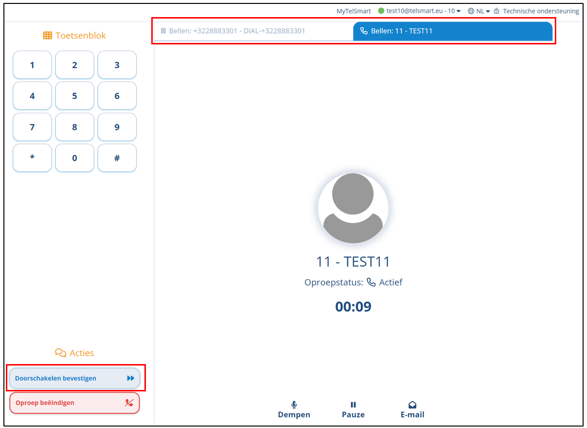 Tenslotte merk je bovenaan dat nu de inkomende oproep niet langer als actief staat weergegeven en in wacht staat, deze persoon hoort nu een wachtmuziek. Een 2de tab is nu zichtbaar die als actief staat weergegeven. Wanneer de persoon naar wie je wenst door te schakelen heeft opgenomen, kan je dan de doorschakeling uitvoeren door te klikken op Doorschakelen bevestigen.