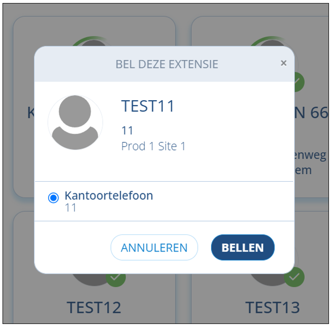 - Je kan een gebruiker aanklikken waarna onderstaande popup opent om een oproep te starten.