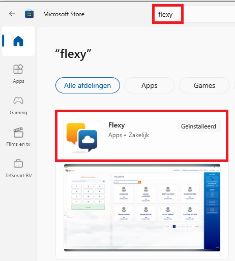 Stap 2: Eenmaal in de Microsoft store, dien je terug in het zoekveld het woord Flexy in te voeren. Hiermee ga je in de Microsoft store op zoek achter onze Desktop applicatie om mee uit te bellen. Je klikt zoals op onderstaande afbeelding op de app flexy en drukt dan op Downloaden/Installeren.