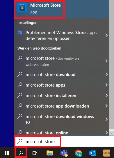 Stap 1: Je klikt op het vergrootglas naast het Windows vlaggetje, in het zoekveld voer je Microsoft Store in. Als je daarna de App aanklikt ga je merken dat hier nu mee de Microsoft Store wordt geopend.