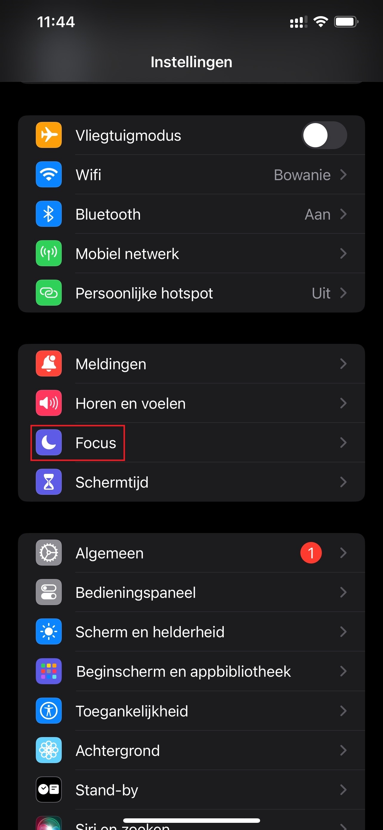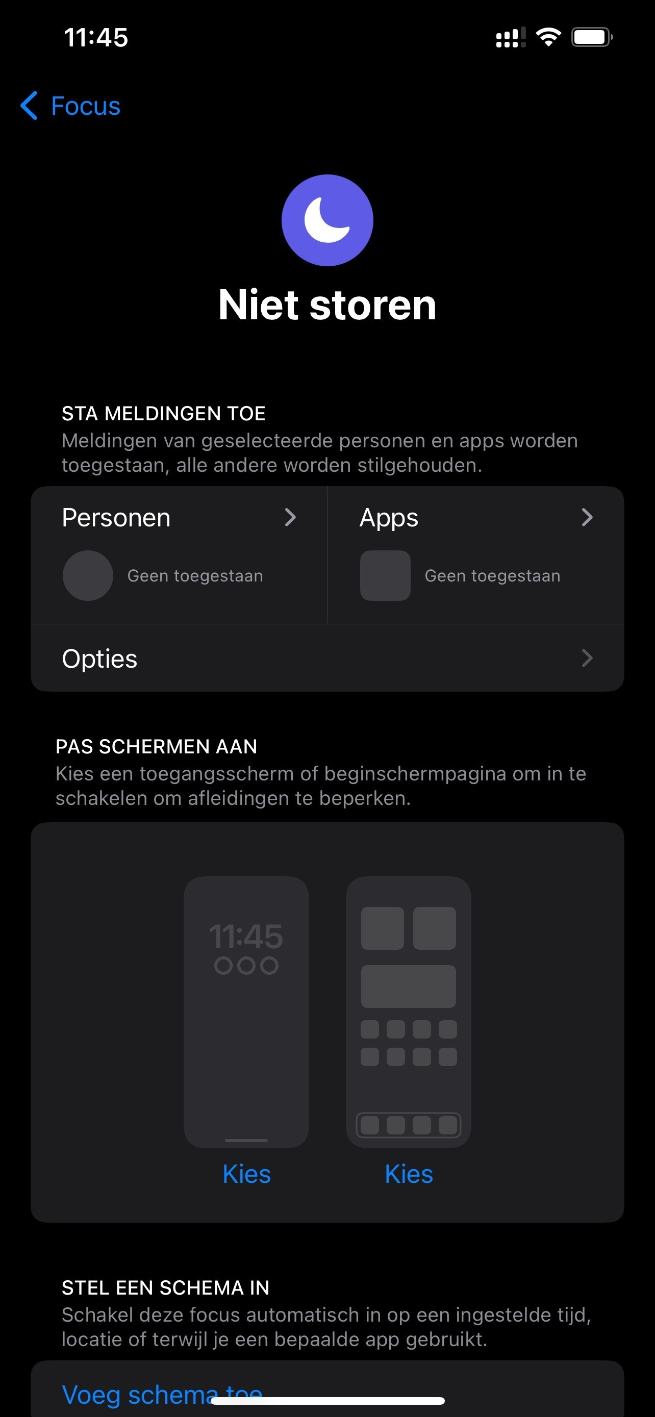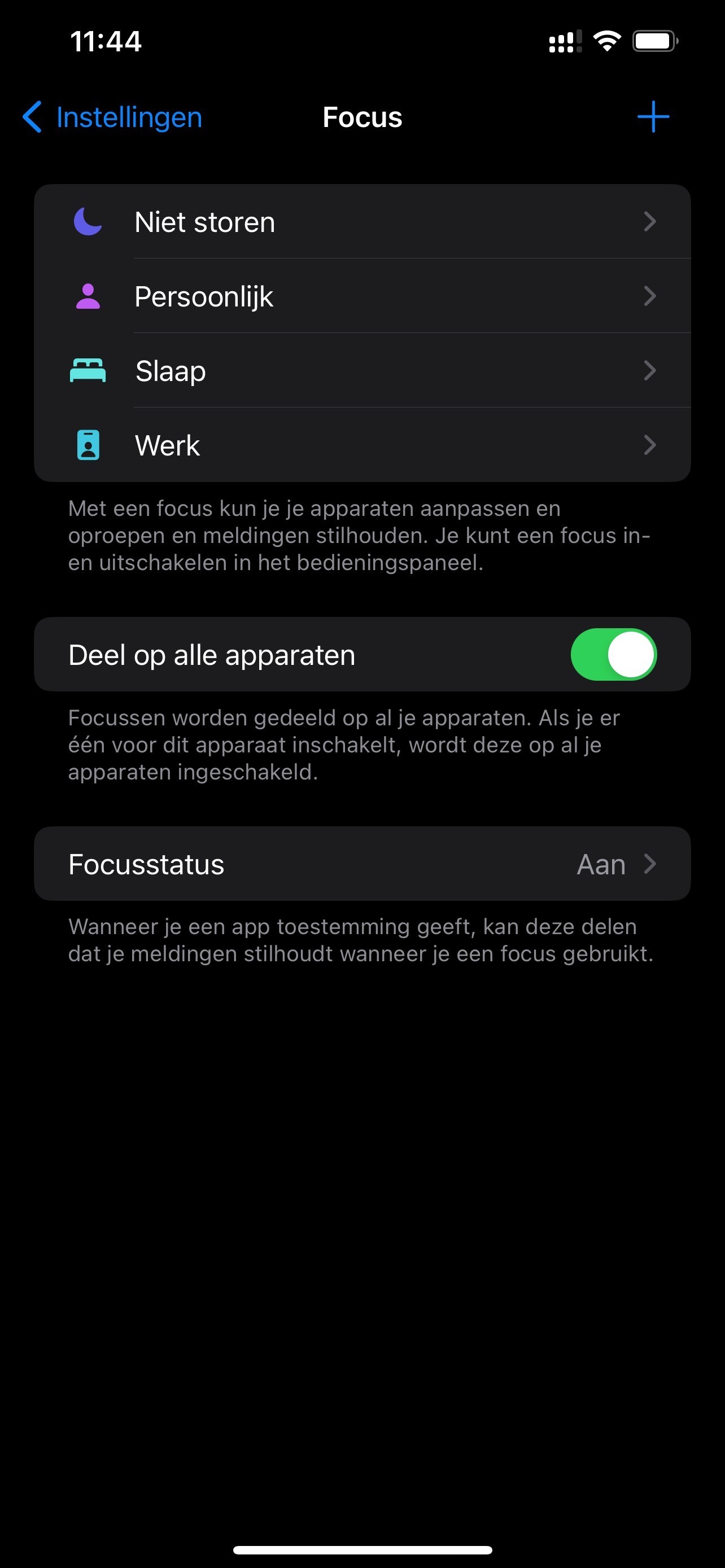 Bij Apple heb je een aantal standaard focus instellingen maar kan je ook vrij statussen bijmaken die ervoor zorgen dat bepaalde meldingen onderdrukt worden.