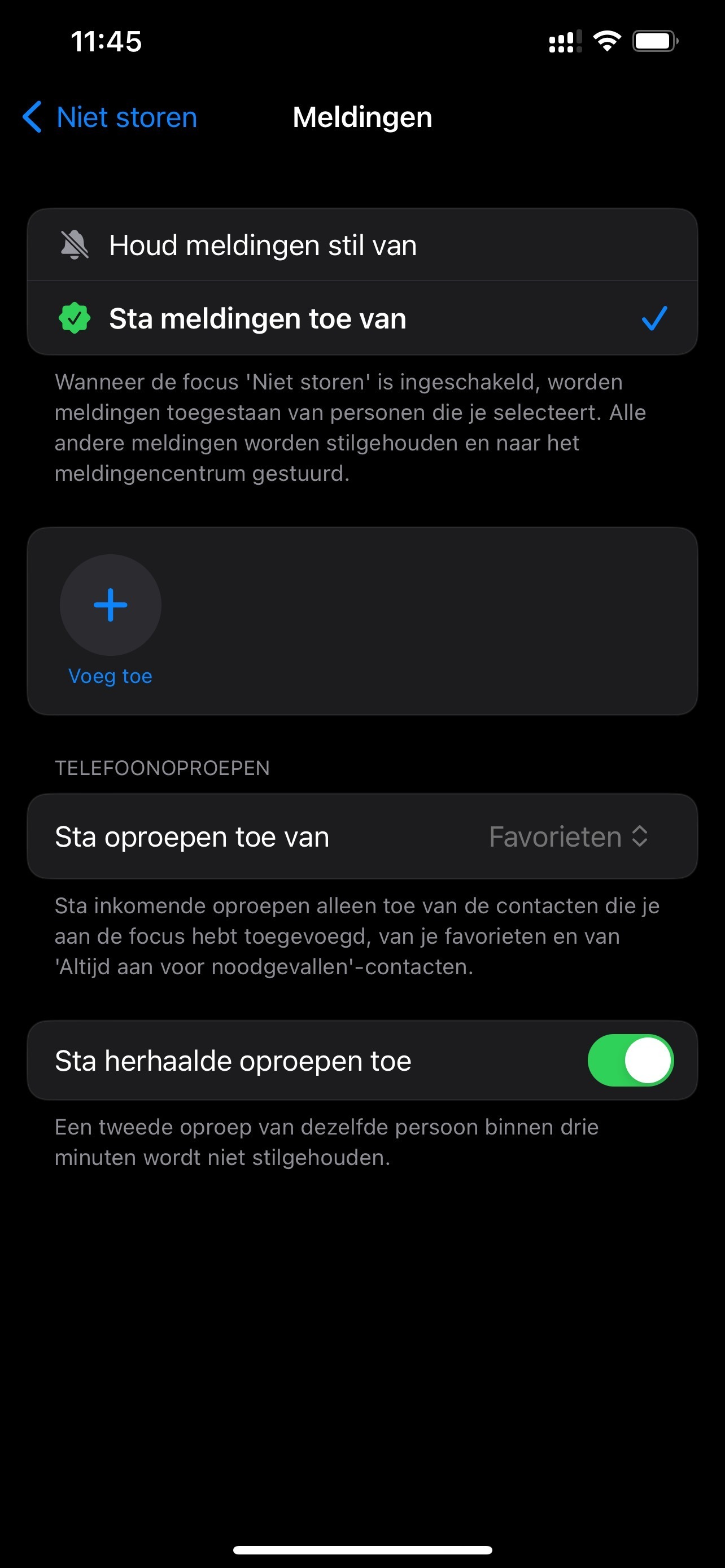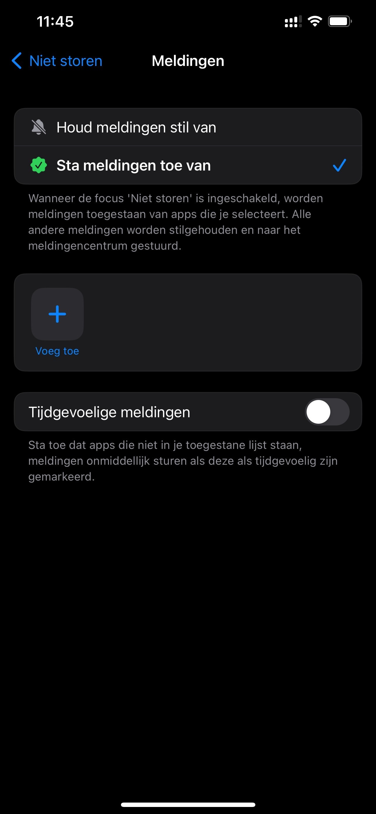 Stap 4: Hieronder even een voorbeeld van de focus status niet storen. Dit zorgt ervoor dat er geen meldingen kunnen doorkomen als deze status is ingeschakeld. Hier kan je kiezen om meldingen van specifieke personen of apps toe te laten.