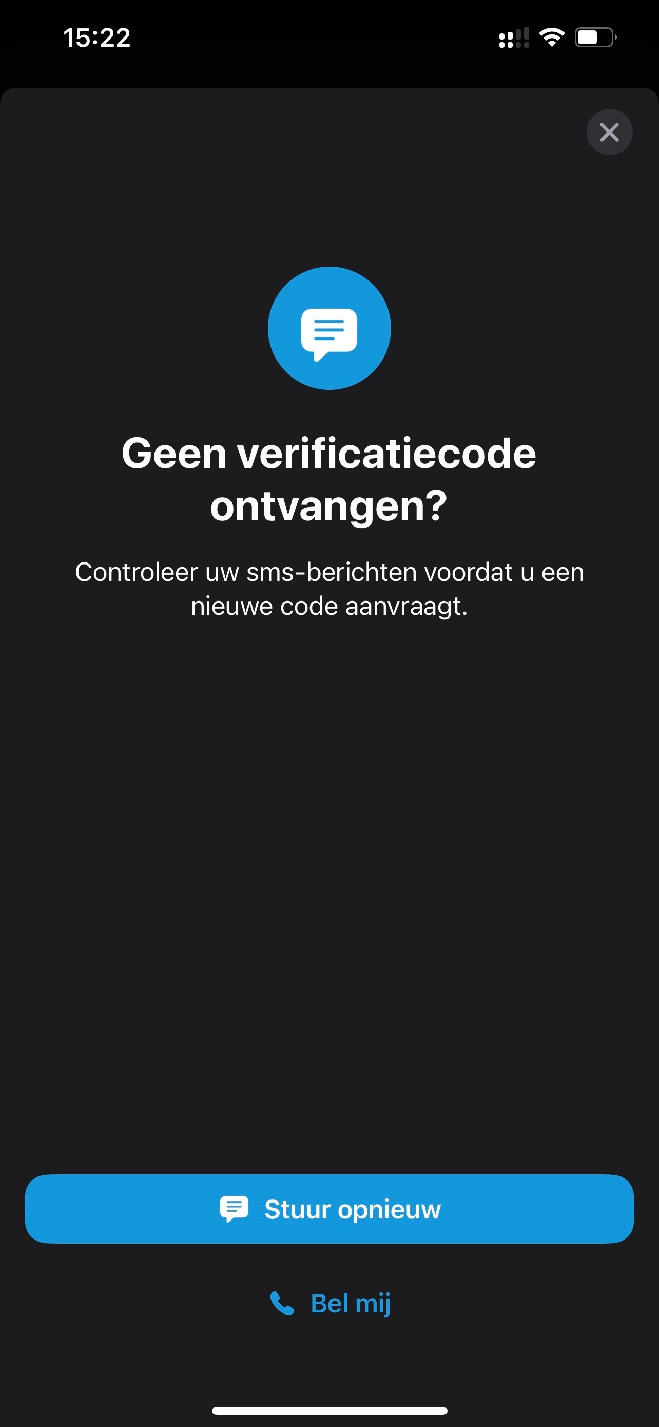 Nadat je op ja hebt geklikt zal Whatsapp proberen je een SMS bericht te versturen op dat nummer. Dit zal NIET werken, je dient dus een 2tal minuten te wachten tot de timer voorbij is. Na het aflopen van de timer zal je zien dat je kan klikken op geen verificatie code ontvangen. Klik op geen verificatiecode ontvangen.