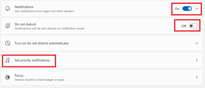 Stap 4: Zorg ervoor dat Notificaties aan staan, en dat Do not disturb (Niet storen) uit staat. Klik daarna op Set priority Notifications (Prioriteit van Notificaties)
