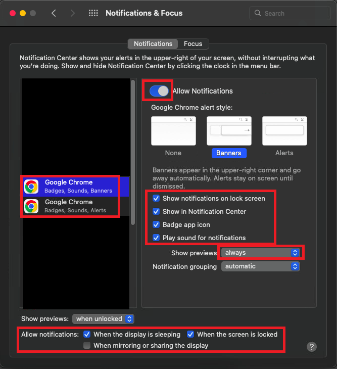 Stap 3: Zoek in de lijst Google Chrome en zorg ervoor dat de notificaties zijn toegestaan en alle onderstaand is aangevinkt. Kies ook voor show previews always. Zo worden altijd de meldingen toegestaan. Onderin vink je ook de nodige vakjes aan om de meldingen/pop-ups van whise toe te staan.